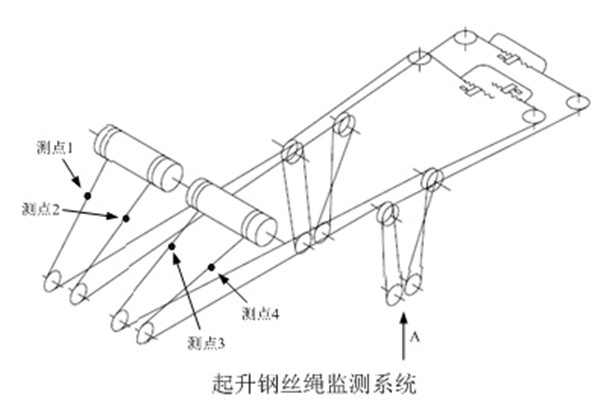 作为岸桥起重机结构重要的起升机构,其钢丝绳系统共布置了4个测点,示意图如下: