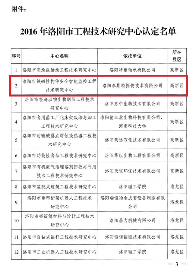 根据《洛阳市工程技术研究中心管理办法》(洛市科【2006】95号)规定,经组织申报、初审、现场考察、会议评审等评审程序,洛阳泰斯探伤技术有限公司被认定为洛阳市铁磁性构件安智能监控工程技术研究中心。